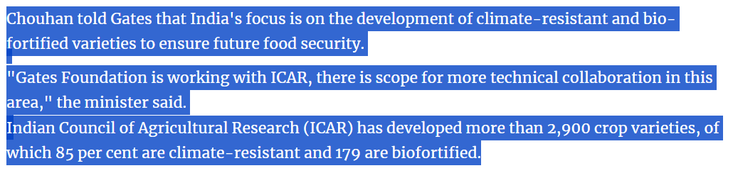 Especially in the backdrop of Gates Foundation supporting ICAR and IRRI with grants for making staple varieties adaptable to climate stresses from production standpoint and biofortify them from consumption standpoint.3