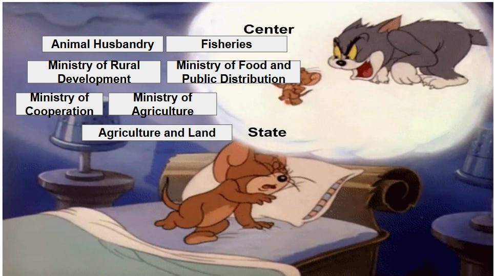 While the former wants to centralize agriculture (ironically despite the profusion of decentralized digital public infrastructure), the latter is working in the opposite direction to resist the centralization of an essential state subject.
