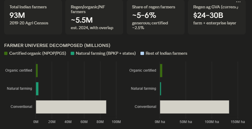 There is significant overlap between the organic-certified and natural farming populations. Netting out duplicates, the conservative unique estimate of farmers practicing some form of regenerative, organic, or natural farming is 4.5–5.5 million, or roughly 5–6% of all Indian farmers. The certified-only share — those who can command a market premium — is closer to 2.5–3%.
