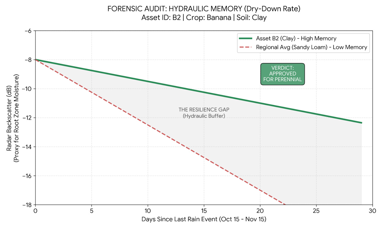We tracked the Radar Dry-Down Curve (Dielectric Decay) following the Oct '24 post-monsoon rains. THE FORENSIC DATA: 📉 Regional Baseline: Lost moisture signal in 7 Days (Steep Slope = Low Memory). 📈 Asset B2 (Clay): Retained root-zone moisture for 22 Days (Flat Slope = High Memory). THE VERDICT: [APPROVED] Because the Soil's Inertia (22-day buffer) matches the Crop's thirst, we validated the "Lock-in" for this 12-month Banana asset.