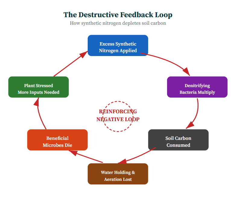 When Chacko started applying synthetic nitrogen fertilizers in the 1980s, yields initially increased. But each year required more inputs. The soil hardened. Pests proliferated. Costs mounted. He was stuck in a reinforcing feedback loop running in the wrong direction: More nitrogen → denitrifying bacteria proliferate → soil carbon consumed → microbes die → plants stressed → more inputs needed.