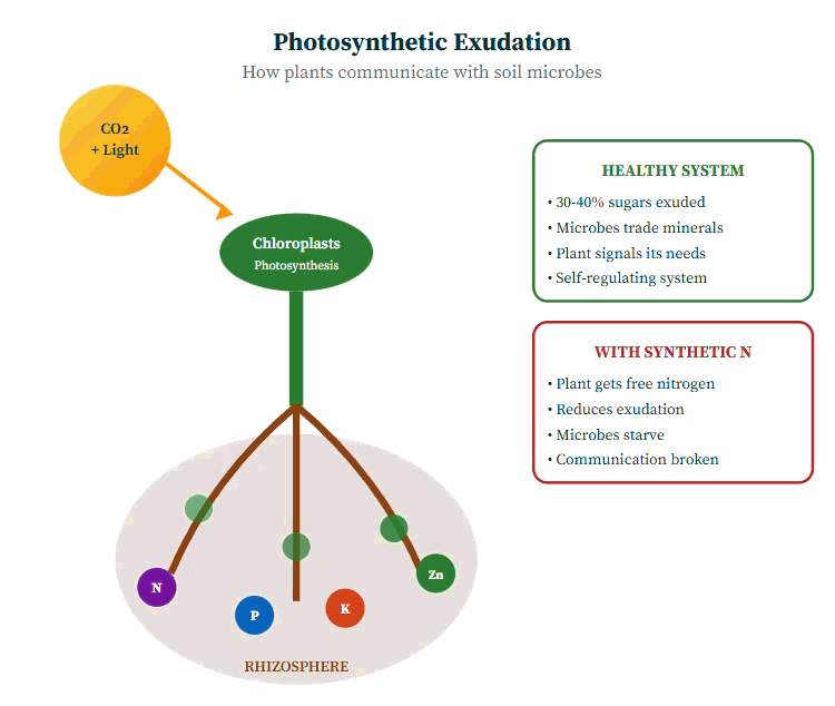 What scientists discovered only after 2000—through technologies like isotope tracking and confocal laser scanning microscopy—is that plants exude 30 to 40 percent of their photosynthetic products directly into the soil through their root tips. They are not leaking. They are transacting.