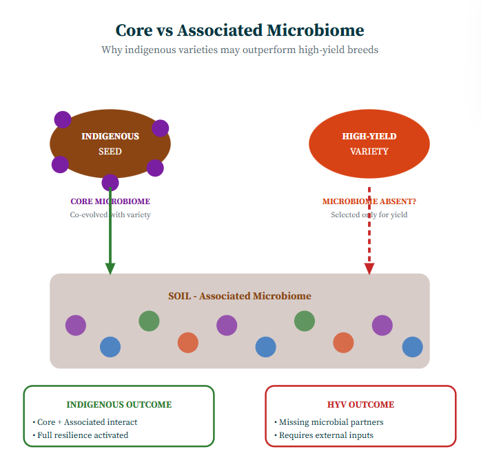 During our conversation, Chacko argued that indigenous varieties carry what he calls their “core microbiome” within the seed itself. When such seeds germinate, they arrive with a pre-adapted microbial community that has co-evolved with that variety over generations. These core microbes then interact with the “associated microbiome” already present in the soil.