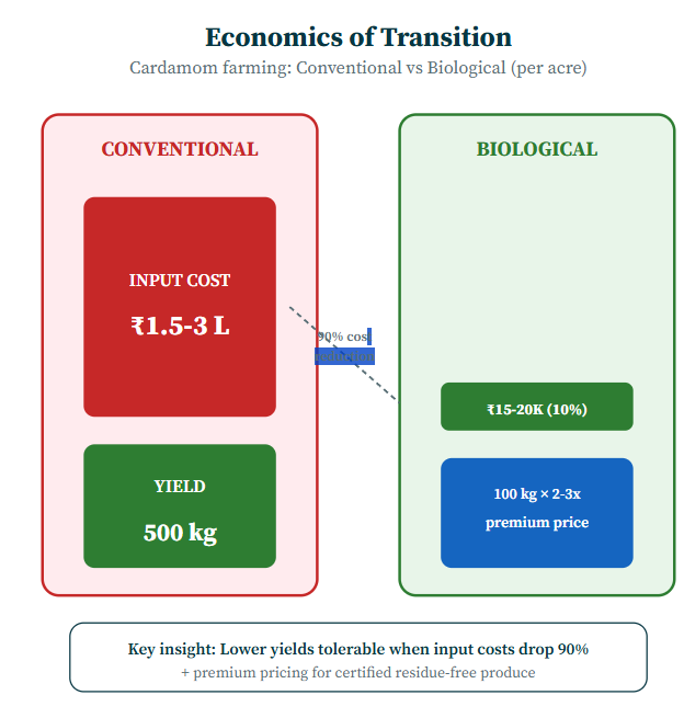 But his cost structure is inverted. He spends perhaps 10% of what his neighbors spend. When his premium buyers pay double or triple the commodity price for certified residue-free cardamom, the math works.