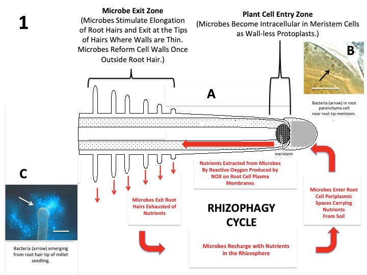 In this cycle, bacteria enter plant root cells at the growing tip, lose their cell walls, get partially digested by plant-produced reactive oxygen species (effectively the plant is eating part of the bacteria to extract nutrients), then surviving bacteria are expelled through root hairs back into the soil where they regain their cell walls and continue foraging for more nutrients.