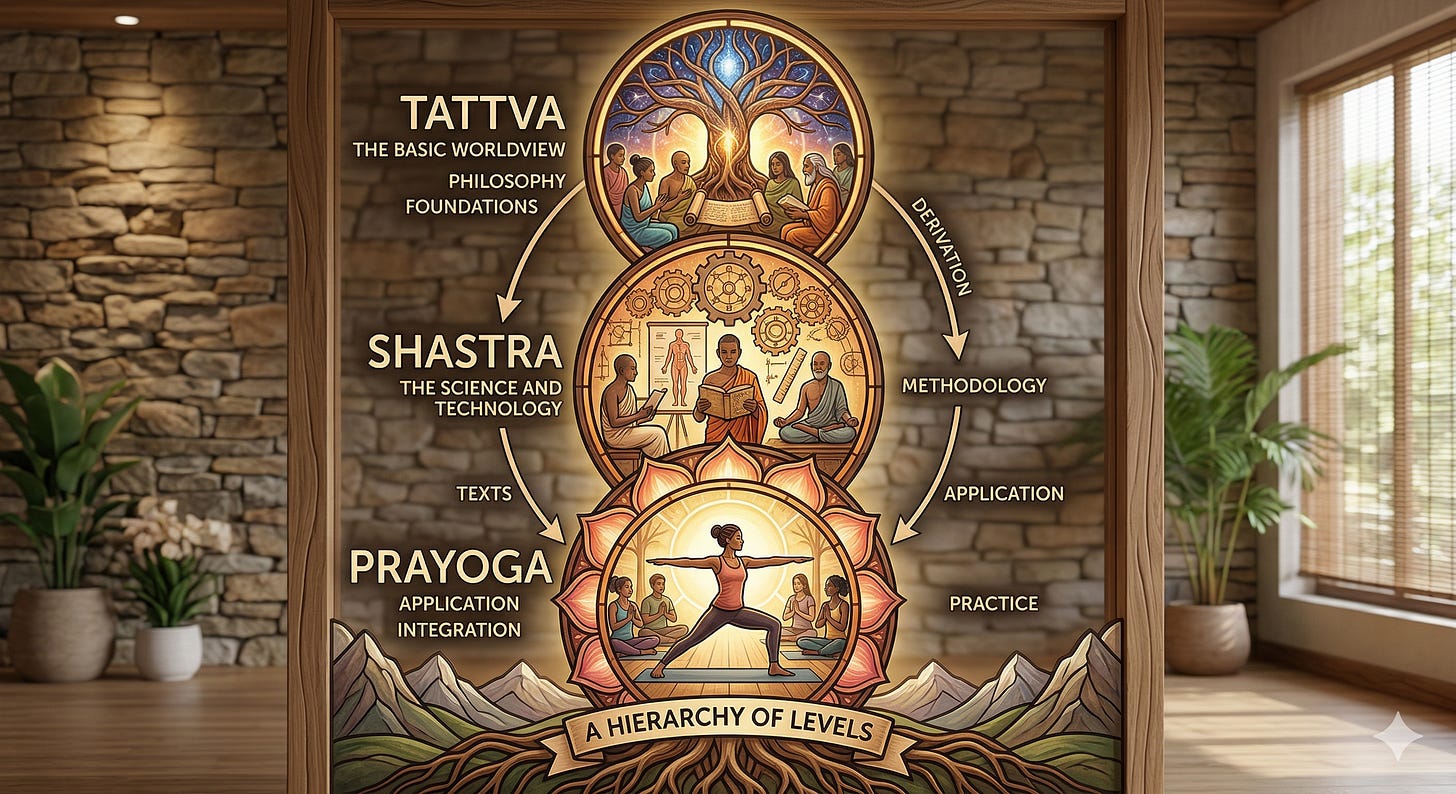 There is also a hierarchy of levels that yoga teachers talk about. One level is tattva -- the basic worldview. Another is shastra -- the science and technology derived from it. The third is prayoga -- application.